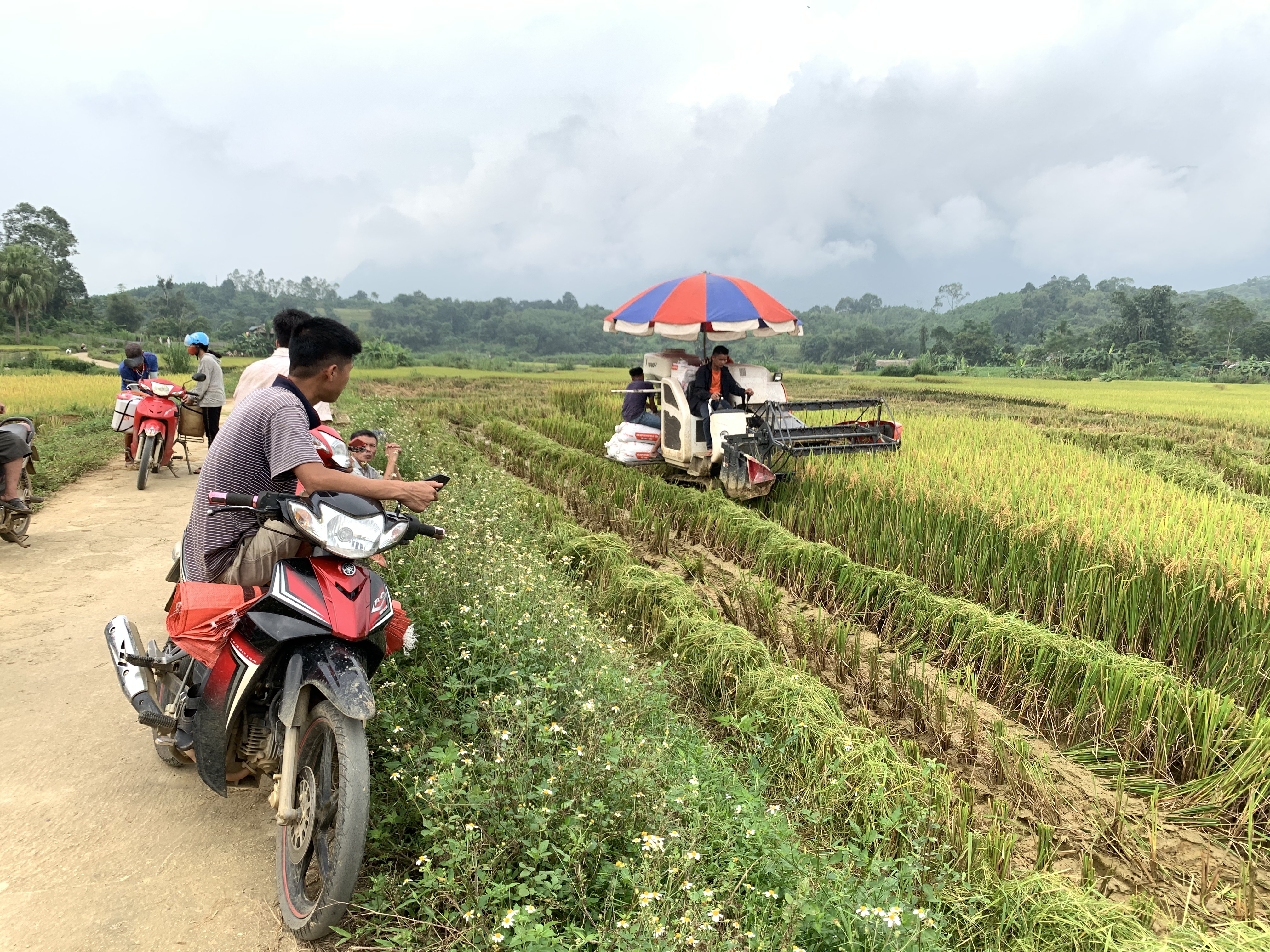 Cơ giới hóa để đẩy nhanh tiến độ thu hoạch vụ mùa tại thôn Bản Tát